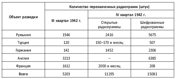 В первый период войны БРО Черноморского флота вел разведку вооруженных сил Румынии, Германии, Турции, Англии и Франции[678]. Результаты его деятельности за третий и четвертый квартал 1942 года приведены в таблице 8. Кроме того, в 1942 году черноморцами был раскрыт код немецких разведчиков, действовавших на Моздокском направлении[679]. Начальник РУ ГМШ ВМФ Воронцов так оценил результаты деятельности морской РЭР на Черноморском флоте к октябрю 1942 года: «Береговой радиоотряд с поставленными задачами командования по радиоразведке на театре в условиях военной обстановки справился. Радиоотряд, несмотря на частую передислокацию сохранил личный состав и материальную часть, не прекращая радиоразведки на театре. Из возросших задач по радиоразведке БРО непрерывно увеличивал количество вахт слежения и перехвата, доведя их до 30 вместо имеемых 16 в январе 1942 года за счет мобилизации внутренних ресурсов»[680].