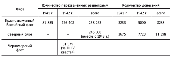 начальный период войны, наибольший объем разведывательной информации, как открытой, так и шифрованной сумели добыть радиоразведчики Краснознаменного Балтийского флота. Результаты деятельности береговых частей радиоразведки советского ВМФ за первый период Великой Отечественной войны приведены в таблице 9.