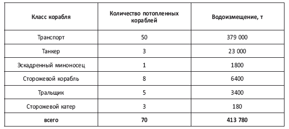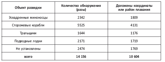 За период с 22 июня 1941 по январь 1944 года средствами морской РЭР Северного флота 14 156 раз были обнаружены корабли противника[714] (результаты обнаружения за этот период по классам кораблей приведены в таблице 10). Кроме того, было дано 1931 место самолетов-разведчиков противника, обнаружено 708 конвоев из 767, прошедших на коммуникациях противника вдоль северного побережья Норвегии. Своевременно было предупреждено о 703 налетах авиации противника на наши объекты, совместно с ПВО – о 31 налете из всех произведенных 852 налетах. При действиях на коммуникациях противника нашими кораблями и авиацией на основании сведений радиоразведки Северного флота было потоплено 70 кораблей и судов различного класса (см. таблицу 11), повреждено 5 транспортов[715].