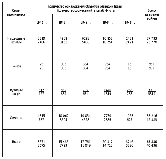 Радиоотряд Черноморского флота с 22 июня 1941 по 30 ноября 1943 года обнаружил: надводные корабли – 425 раз (эскадренные миноносцы – 136, мониторы – 144, канонерские лодки – 13, сторожевые катера – 86, другие – 18); подводные лодки – 113 раз (с 1 июля 1943 по 1 декабря 1943 года); конвои – 143 раза; авиацию прикрытия конвоев – 321 раз; плавающие мины – 368 раз; дислокацию сухопутных частей – 47 раз; дислокацию постов службы наблюдения и связи – 38 раз; сделал 5454 донесения об обнаружении авиации, 168 донесений о состоянии погоды. В периоды участия в обороне Одессы, Сталинграда и Севастополя сделал соответственно 414, 180 и 620 донесений о противнике[729].