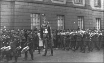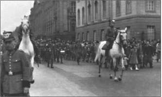 В воскресенье в 12 часов был парад берлинской Главной вахты. На фотографии — дежурный полк противовоздушной обороны. На параде, который происходил каждое воскресенье, рода войск менялись. Слева на фотографии полицейский.