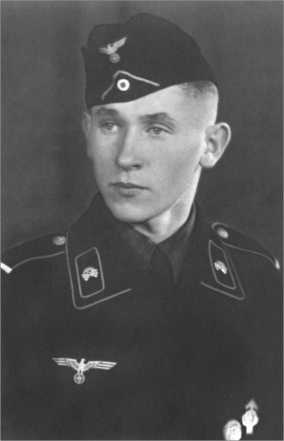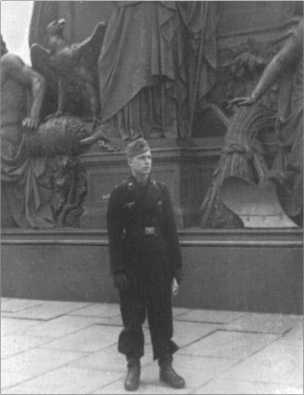 Кандидат в унтер-офицеры Альфред Руббель в черной танковой униформе с пилоткой на голове. Серебряная лычка на погонах указывает на унтер-офицера — кандидата в офицеры. Две серебряные лычки обозначали кандидата в офицеры. Цветом танковых войск был розовый, поэтому кант на погонах, воротнике и петлицах был отделан розовым. Мертвые головы на петлицах происходят из традиций Первой мировой войны. Танкистов, из-за черной униформы и мертвой головы в петлицах, часто путали с эсэсовцами, у которых тоже была мертвая голова на головном уборе и черная униформа.