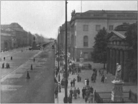 На фотографии самая шикарная берлинская улица — Унтер ден Линден в направлении Бранденбургских ворот. Справа на фотографии «Старая вахта» и Университет Гумбольдта, раньше это был Дворец принца Хайнриха.