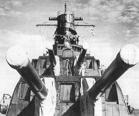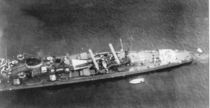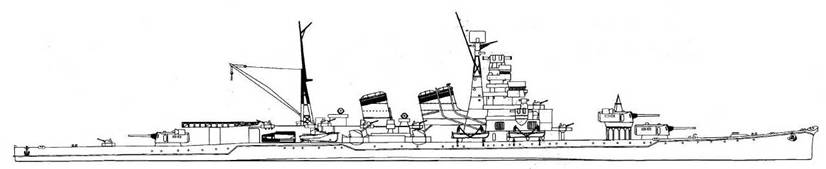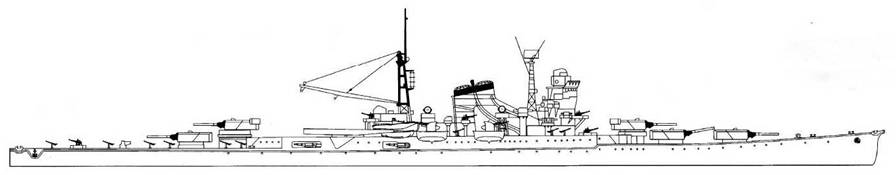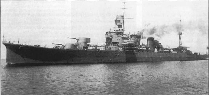 На полном ходу 9 июня 1939 г. тяжелый крейсер «Фурутака» развил скорость в 32,95 узлов. Хорошо на снимке видны новые двухорудийные башни главного калибра типа «Е». Все японские тяжелые крейсера строились гладкопалубными, что улучшало их мореходность в бурных водах и позволяло добиться большей прочности при меньшей массе по сравнению с полубачными корпусами.