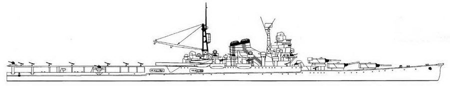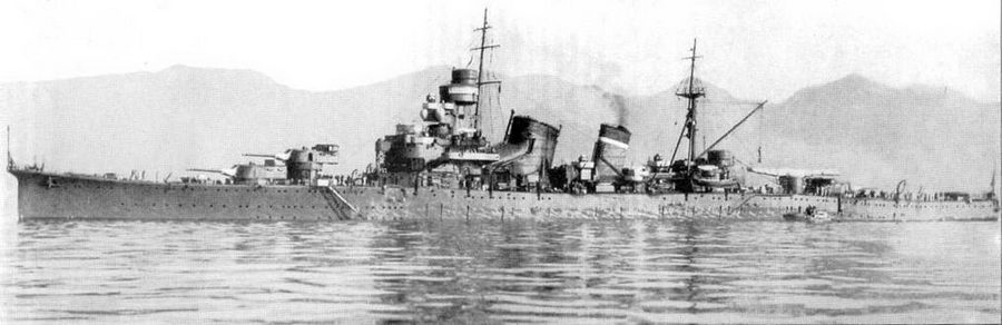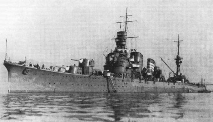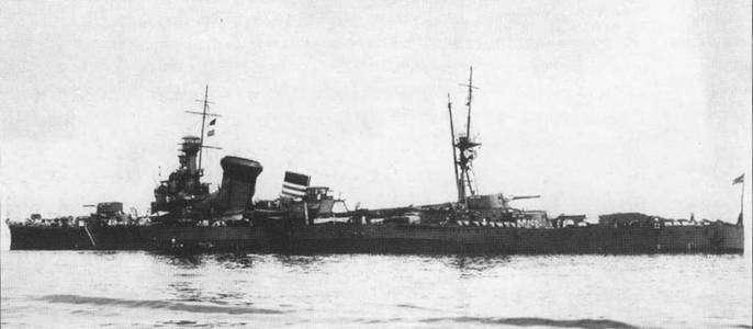 Крейсер «Како» с легкими полубашнями, снимок 1930 г. В ходе ремонта 1936 г. на крейсере смонтировали двухорудийные башни главного калибра и установили на корпусе Були для улучшения остойчивости. Белые полосы на дымовой трубе обозначают трети по счету корабль в 5-й дивизии крейсеров.