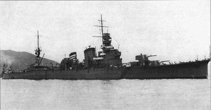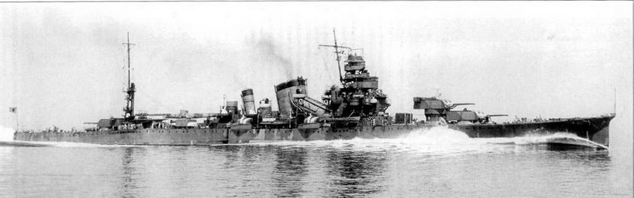 Крейсер «Како» научениях, 1940 г. На корабле поначалу базировались гидросамолеты Каваниши Е7К2 тип 94, которые в начале 1942 г. заменили гидропланами Аичи Е13А1 тип 0. На снимке хорошо видны поворотные четырехтрубные торпедные аппараты крейсера.