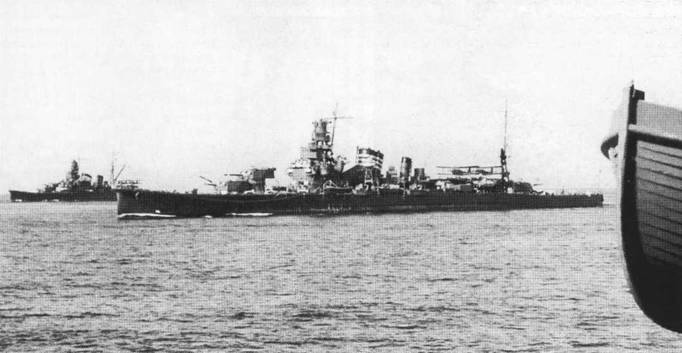 «Фурутака» на полном ходу обгоняет «Кинугасу», учения октября 1941 г. На обоих крейсерах установлены новые двухорудийные башни главного калибра, були и авиационные катапульты.