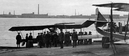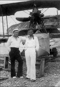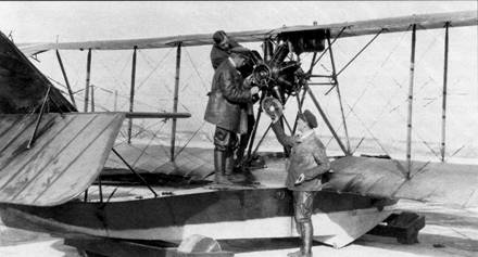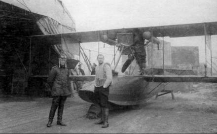 Летающая лодка «Кертисс» (Curtiss) авиации Черноморского флота на береговой базе в Одессе. На переднем плане летчик Корсаков (в свитере) из армейского 32-го авиаотряда, приехавший в гости к морским авиаторам