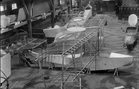 Летающие лодки М-5 в процессе постройки на ПРТВ С. С. Щетинина. На заднем плане видна другая продукция предприятия: монопланы «Ньюпор-IV» и ящики для санитарных повозок