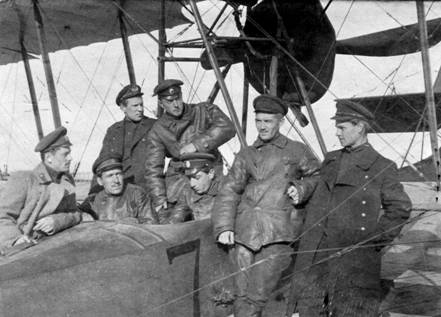 Руководящий состав летной школы им. Троцкого у аппарата с бортовым номером «7». Часть авиаторов, явно из офицеров, еще носит российские кокарды на своих головных уборах. Другие личности, более похожие на мотористов или на комиссаров, не имеют вообще никаких знаков отличия, а у еще одного товарища на фуражке прикреплена «капуста» (или «краб») с красной звездой
