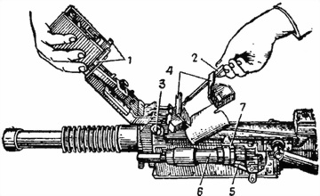 5) Отделить затвор с возвратными пружинами от ствольной коробки (рис. 7), смещая его назад; отделить возвратные пружины от затвора.