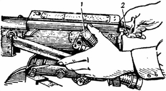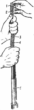 4) Собрать возвратные пружины. Вставить стержень в направляющую и надеть возвратную пружину; удерживая пружину стержнем вниз и сжимая ее нижние витки, вывести конец стержня наружу и присоединить замок.