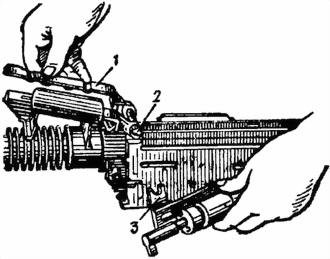 — отделить подаватель: повернуть ось подавателя примерно на 90°, выбить ее выколоткой; отделить подаватель, пружины и штырь;