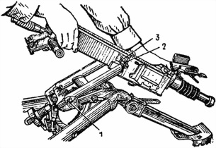 2) Присоединить ствольную коробку к станку. Ввести цапфы верхней люльки станка в цапфенные гнезда ствольной коробки, наклонив ее на 15–20°; оттянуть фиксатор вправо, опустить заднюю часть ствольной коробки вниз до отказа (до совмещения серьги ствольной коробки с проушиной станка) и отпустить фиксатор.