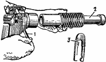1 — извлекатель; 2 — фиксаторы досылателя; 3 — рычаг бойка