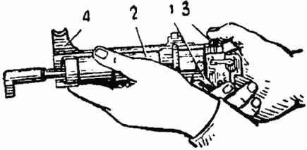 1 — шептало; 2 — ударник; 3 — фиксатор штока; 4 — направляющая