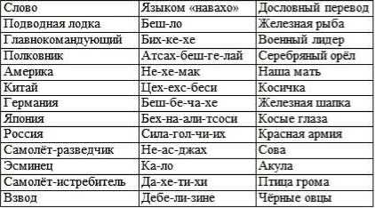 Наиболее интересным во всей этой истории было то, что в языке «навахо» отсутствовали военно-технические термины, которых там и быть не могло. Однако был придуман остроумный выход: несуществующие в языке слова стали обозначать с помощью комбинации других слов (см. таблицу).