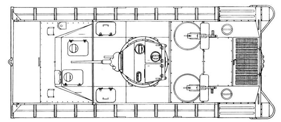 (радиста) сняли перископический смотровой прибор и установили лобовой 7,62-мм пулемет в шаровой опоре для самообороны танка в переднем секторе. Жалюзи моторного отделения прикрыли бронещитками. Наконец, установили дополнительное бронирование кормовых пулеметных установок так, чтобы при стрельбе из пулемета над броней возвышалась только голова пулеметчика в каске (за характерную форму эти изогнутые бронещиты прозвали «трубами»). Машины позднего выпуска имели по четыре углубления-ступени в бортах понтонов вместо двух на машинах ранних выпусков, могли оборудоваться и дополнительной бронезащитой ходовой части.
