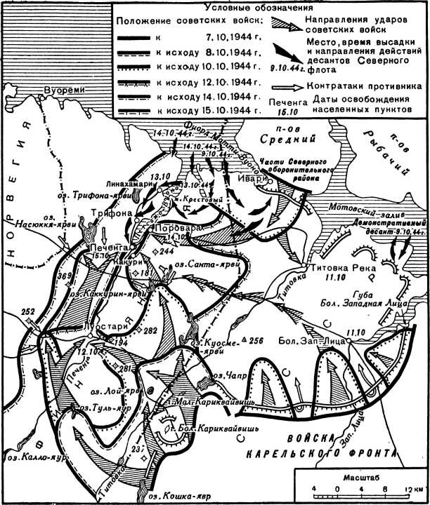 В ночь на 15 октября войска Карельского фронта форсировали р. Печенга и в тесном взаимодействии с частями морской пехоты и десантами Северного флота, ударом по сходящимся направлениям, разгромили вражеский гарнизон и овладели городом и портом Печенга — важной военно-морской базой и мощным опорным пунктом обороны противника на Крайнем Севере. В боях за Печенгу враг понес большие потери в живой силе и технике, оставив на поле боя сотни убитых. В районе населенного пункта Насюккя был полностью взят в плен батальон пехоты противника со всем вооружением.