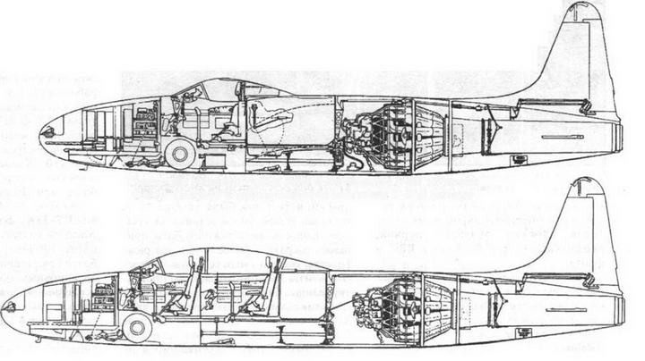 Сравнение компоновочных схем истребителя F-80 "Шутинг Стар" (вверху) и тренировочного самолета Т-33А (внизу)