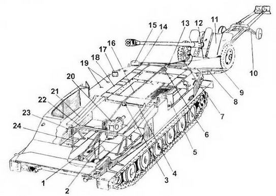 1 — нагнетательный вентилятор; 2,14— плафоны; 3 — вытяжной вентилятор; 4,5,6,8,9,12,13,16,20 — листы перегородки силового отделения; 7 — крышки заднего люка; 10 — откидывающийся лист задней стенки; 11 — рукоятка привода механизма защиты двигателя от попадания воды; 15 — аппарат № 3 ТПУ; 17,18 — сиденья десанта; 19,22 — ящики для ЗИП; 21 —листы пола; 23 — укладочный ящик ТВН-2Б; 24 — ручной огнетушитель