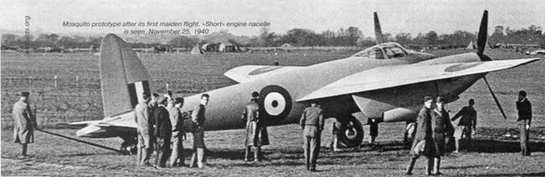 Деревянное детище «Де Хэвилленд» все еще мало занимало умы Министерства авиации, но создатели «Москито» упорно продвигались к своей цели. Первый экземпляр построили в Солсбери- Холле. 3 ноября его на двух трейлерах перевезли в Хэтфилд, где собрали, оснастив двигателями «Мерлин» с одноступенчатыми двухскоростными турбонагнетателями и трехлопастными пропеллерами фиксированного шага «Де Хэвилленд Гидроматик». Машина получила желто-черную окраску и гражданскую регистрацию Е0234.19 ноября под управлением сына босса Джеффри де Хэвилленда-младшего самолет выполнил первые пробежки по аэродрому. 24 ноября удалось сделать небольшие «подскоки». На следующий день экипаж в составе де Хэвилленда и главного двигателиста фирмы Джона Уолкера (John Е. Walker) впервые поднял машину в воздух.