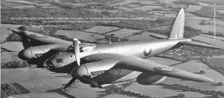 «Москито» отличался хорошей устойчивостью при полете на одном двигателе. На фото: «Москито» PR.XVI, который имел герметичную кабину и был самым массовым вариантом разведчика