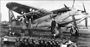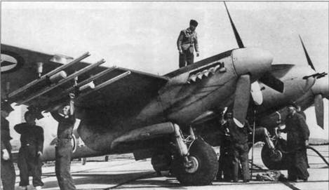 Снаряжение «Москито» FB.VI из 143-й эскадрильи неуправляемыми ракетами. Справа – «Москито» FB.VI (рег.ММ401) из 464-й эскадрильи, вернувшийся после атаки позиций «Фау-1» близ Па-де-Кале. 21 февраля 1944 г.