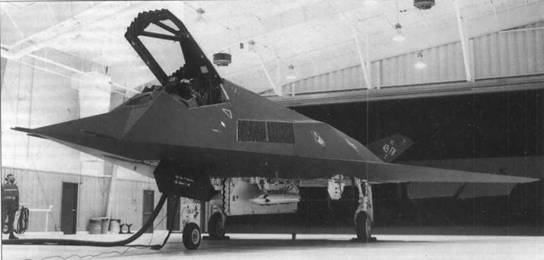 F-117А командира 49-го тактического истребительного авиакрыла в ангаре авиабазы Холломэн, шт. Нью-Мексико. Самолет готовят к ночному тренировочному полету. На трапеции бомбоотсека подвешены практическая бомба SUU-20 и контейнер с шестью практическими бомбами BDU-33. Гидросистема самолета пока не работает – элевоны опустились на нижние упоры под действием Земного тяготения. Каждый ангар базы Холломэн вмещает два F-117, стоянки самолетов в одном ангаре разделены противопожарной перегородкой, выдерживающей температуру до 1000 градусов по Фарегейту (537,8 градусов по Цельсию) в течение 90 минут. Ангары снабжены системой кондиционирования, сохраняющей радиопоглощающее покрытие самолетов.