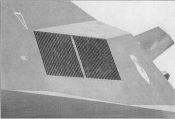 Крупный план сетки воздухозаборника. Щетка воздухозаборника выдвинута, обычно она находится в убранном положении в специальном отсеке перед губой воздухозаборника. Идея заключалась в том, что движение щетки будут дополнительно снижать ЭПР воздухозаборника при прямом облучении РЛС.