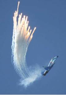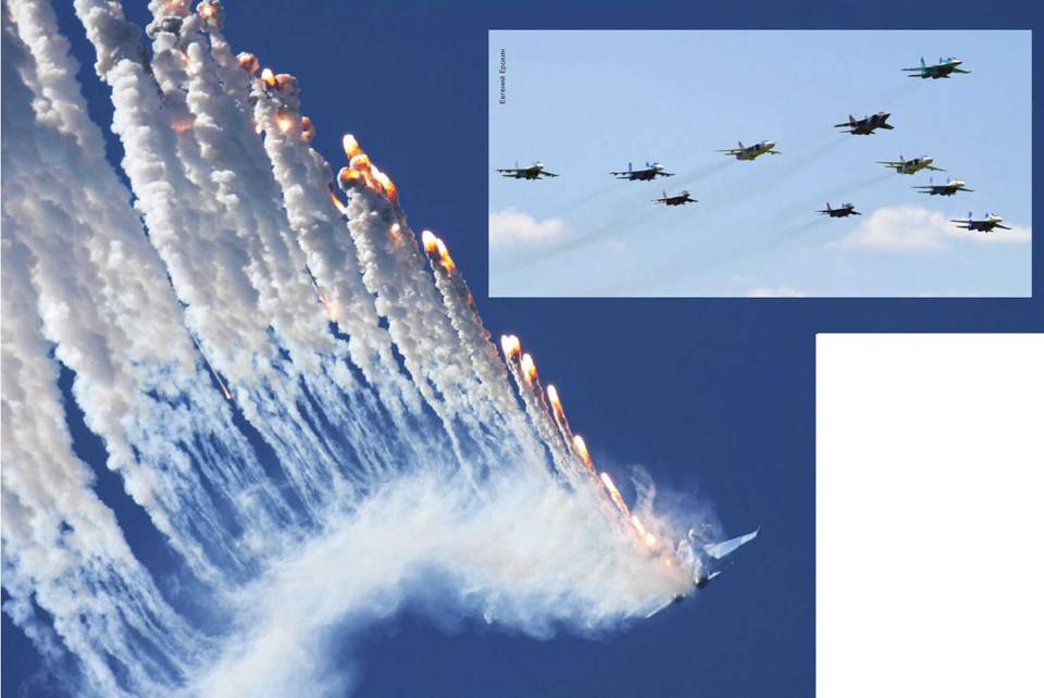 Не успели зрители перевести дух, как в небе начался пилотаж самолетов Су-27, грациозно прошедших в боевом порядке «ромб». Тут же их сменило в воздухе несколько истребителей МиГ-29 с одиночным и групповым пилотажем и имитацией встречного воздушного боя. Штурмовики Су-25 отработали в режиме атаки наземных целей и показали групповой пилотаж в составе шести самолетов. В ходе воздушного показа самолетами выполнялись такие фигуры высшего пилотажа, как «петля Нестерова», «колокол», «горизонтальная бочка», «нож», «перевернутый полет», «роспуск» и др. Зрелищную программу дополнил проход в сомкнутом боевом порядке смешанной группы из дести самолетов – двух МиГ-29, четырех Су-27, двух Су-24М, МиГ-31 и Су-34.