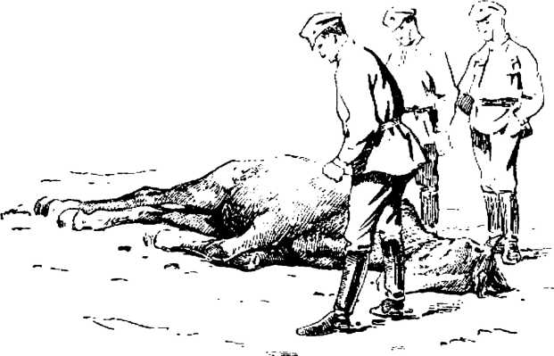 Красноармеец также должен каждый раз при уборке лошади или в конюшне при даче ей корма наблюдать нет ли у ней царапин, ссадин или опухолей. Если он заметит такие повреждения, то такой лошади немедленно должна быть оказана ветеринарно-лечебная помощь фельдшером или врачом. Вовремя начатое лечение даже значительного повреждения быстро приводит лошадь к выздоровлению. Наоборот, даже незначительная ранка или царапина, если ее запустить и загрязнить, может привести лошадь к инвалидности и даже к смерти. Это нужно каждому красноармейцу иметь в виду и быть внимательным при осмотре своей лошади.