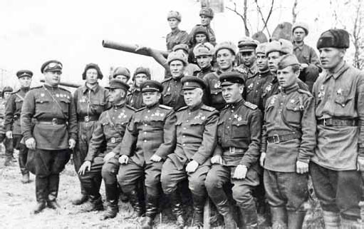 Группа передовиков танкистов 5-го Сталинградского танкового корпуса с командованием – Н. С. Хрущевым, Н. Ф. Ватутиным, А. Г. Кравченко – после вручения корпусу гвардейского знамени. Воронежский фронт, май 1943 г.