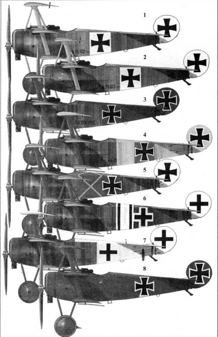Самолет FI 102/17 был презентован Рихтгофену в августе 1917 г. 15 сентября на этом, самолете был сбит и погиб обер-лейтенант Курт Вольф. Предсерийные FI целиком окрашивались в светлый серо-голубой цвет, поверх которого наносились узкие полосы оливково зеленого цвета, создавая эффект камуфляжа. Нижние поверхности оставались чистыми серо-голубыми. Капот двигателя и диски колес скорее всего оливково-коричневые. В нижней части руля направления нанесен серийный номер 1729.
