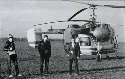 Для контроля за радиоактивным заражением местности на Ка-26 доставлен дозиметрист (крайний слева). Район Чернобыля, конец апреля 1986 г.