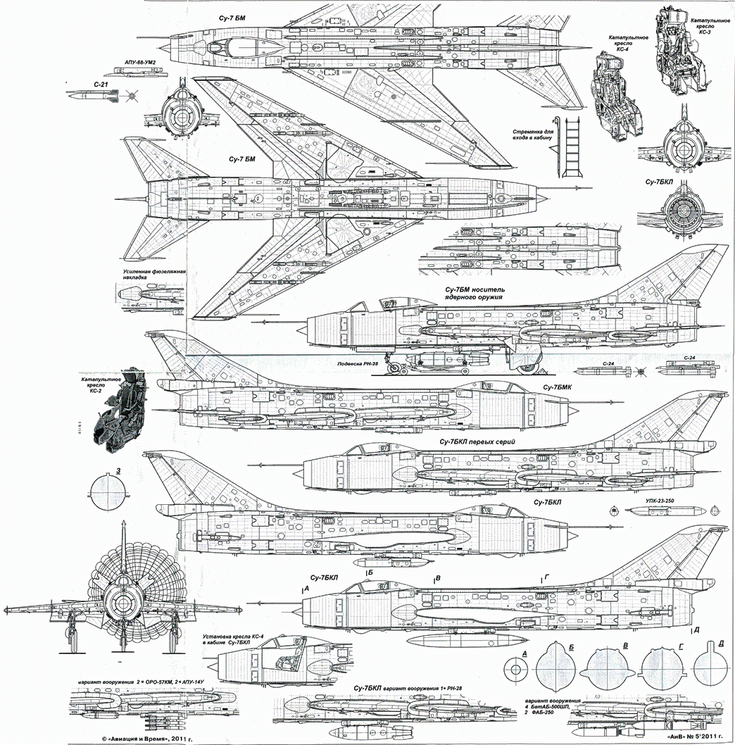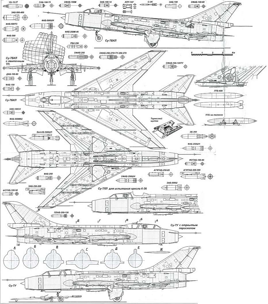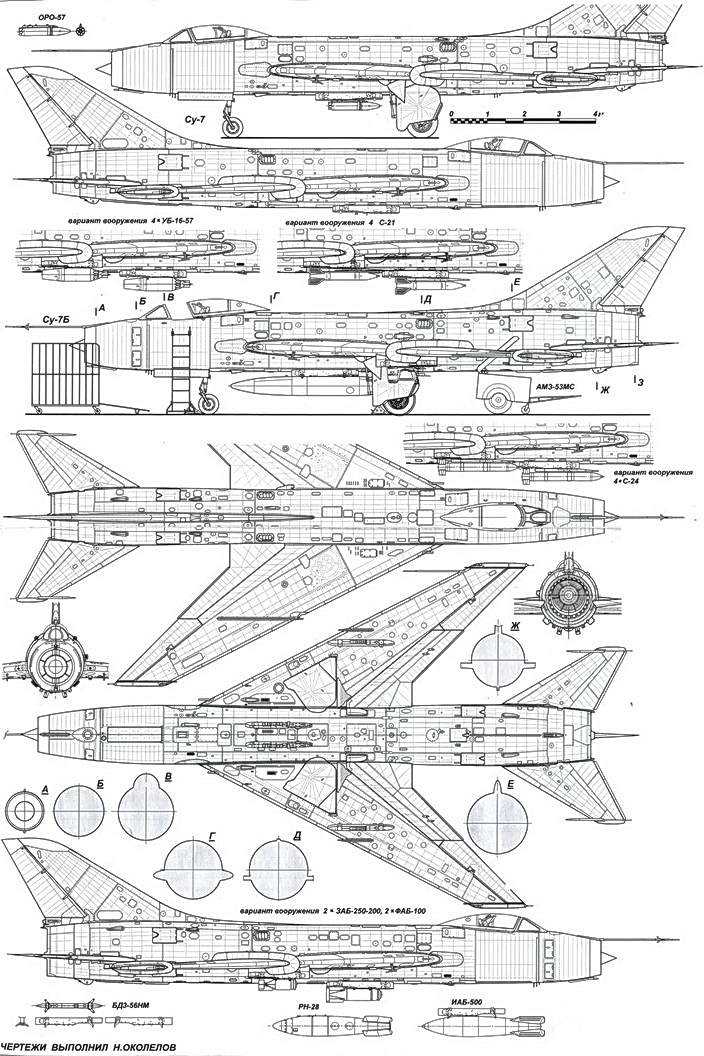 Су-7 Су-7Б Су-7БМ Су-7БМК Су-7БКЛ Су-7У Длина самолета с ПВД, м 18,475 18,55 18,72 18,93 Размах крыла, м 9,31 Площадь крыла, м2 34,0 Двигатель АЛ-7Ф АЛ-7Ф-1 АЛ-7Ф-150 АЛ-7Ф-250 Тяга двигателя макс., кгс 6850 6800 Тяга двигателя форс., кгс 8950 9200 9600 Макс. взлетная масса, кг 10859 13043 13830 9287 15090 15210 Нормал. взлетн. масса, кг 9245 10839 11730 12260 12550 12990 Макс. бомб, нагрузка, кг 1000 2000 2500 2000 Скорость на высоте, км/ч: — у земли 1250 1200 1150 1200 1150 — 13000 м 2120 2120 2150 2150 2070 Набор 10000 м, мин. 4,2 4,3 5,3 6,2 6,4 Потолок, м 15000 19500 18500 17600 17000 Дальность полета, км 890 1130 1135 1000 820 Посадочная скорость, км/ч 260-280 270-280 280 — 290 285-295 300-320 Длина пробега с ТП, м 1000 1100 1200 700 850 Длина пробега без ТП, м 1200 1300 1600 1700 1800