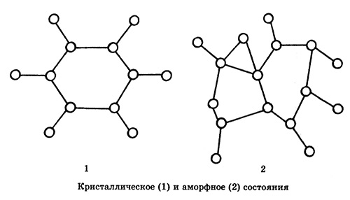 Если же скорость оттока тепловой энергии высока, то вязкость вещества увеличивается задолго до того, как между молекулами установится дальний порядок. Структура охлажденного вещества по-прежнему остается неправильной или почти неправильной, тогда как вязкость резко отличается от таковой, свойственной жидкостям. Тело переходит в новое агрегатное состояние, аморфное.