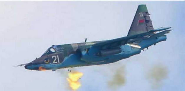 Штурмовик Су-25 ВВС Республики Беларусь ведет обстрел мишени из бортовой пушки
