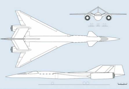 С-21 Ту-444 Экипаж, чел. 2 2 Число пассажиров, чел. 5-12 10 Тип двигателей 3хАЛ-363 2хАЛ-32М Взлетная тяга, кгс 3х9100 2х9700 Длина самолета, м 32,5 36,0 Размах крыла, м 23,6 16,2 Площадь крыла, м2 213 Высота самолета, м 6,51 Взлетная масса, кг 56 400 41 000 Масса пустого самолета, кг 27 600 19 300 Запас топлива, кг 28 000 20 500 Крейсерскаое число М - сверхзвуковое 2,0 2,0 - дозвуковое 0,9 0,95 Практический потолок, м 18 000 Дальность полета, км 7800 7500 Потребная длина ВПП, м 2000 1800Три «четверки» от «Туполева»