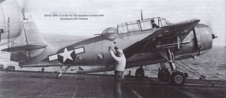 В конце 1943 г. начался выпуск ракеты AR, представлявшей собой развитие предыдущей нар, но с тяжелой боевой частью калибром 5 дюймов. Тонкостенный корпус из высокопрочной стали вмещал гораздо больше взрывчатки, и это оружие было уже эффективно не только против подлодок, но и для уничтожения складов и даже полевых укреплений. Однако 8 «рельсов» длиной по 1778 мм даже без ракет уменьшали скорость на уровне моря на 31,5 км/ч, да «ерши» антенны ASB тоже брали свое, и такой самолет был пригоден только для противолодочных операций.