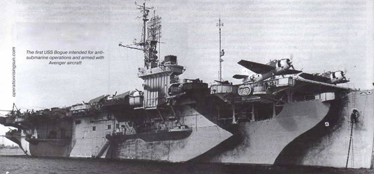 26 сентября 1942 г. в состав BMC США вошел USS Bogue – головной корабль в серии легких авианосцев. Со скоростью хода 18 узлов он не мог идти в общем строю с большими авианосцами, которые развивали 30-34 узла, зато для охраны конвоя характеристики «Боуга» вполне подходили. При водоизмещении в 9880 т, длине 151 м и ширине 34 м он вмещал 24 самолета: истребители F4F «Уайлдкет» и ударные TBF-1.