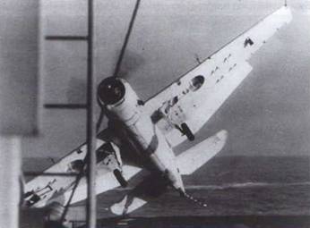 Характерная авария TBM-1CD с установленным в правой консоли крыла контейнером антенны радара AN/ASD-1.