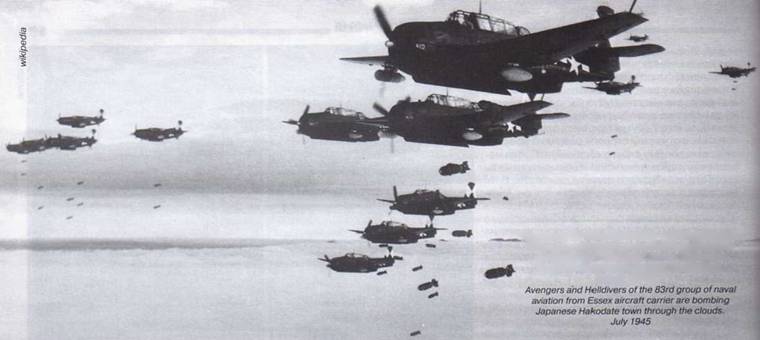 Самолеты «Эвенджер» и «Хэллдайвер» 83-й авиагруппы палубной авиации с авианосца «Эссекс» из-за облаков бомбят японский город Хакодате. Июль 1945 г.