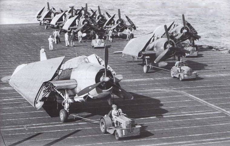 На «Эссексах» базировалось по 90-110 самолетов – обычно по 36 истребителей «Хэллкет» и пикирующих бомбардировщиков «Хэллдайвер», а также 18 «Эвенджеров» ТВМ-3. Часто количество пикировщиков увеличивали, a F6F заменяли истребителями-бомбардировщиками F4U «Корсар», которые были крупнее, и торпедоносный компонент сокращали до 10 машин, но при планировании операций он все равно играл роль «козырного туза».