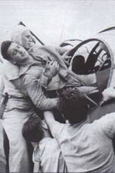 Слева: пилот эскадрильи VT-51 Джордж Буш, будущий 41-й Президент США, в кабине своего ТВМ-1С. Осень 1944 г. Справа: раненого воздушного стрелка Кеннета Бреттона вытаскивают из кабины «Эвенджера» после налета на Рабаул. Авианосец «Саратога», ноябрь 1943 г.
