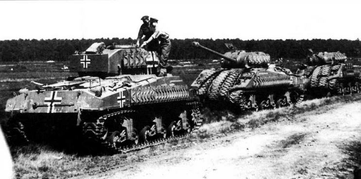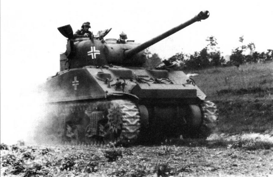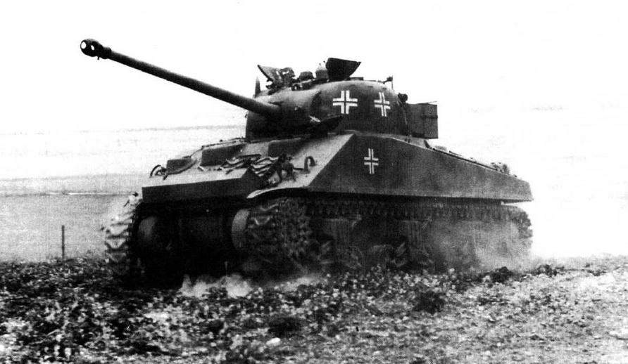 Первые «шерманы» были захвачены немцами в 1942 году у англичан и русских, а в относительно значительных количествах в 1944 году во Франции. В Африку «шерманы» прибыли накануне сражения у Эль-Апамейна, после которого немецкие войска все. время отступали, поле боя оставалось за англичанами и захватить новейший американский танк немцы не могли. Удалось им это только в Тунисе в конце февраля 1943 года. Захваченный «Шерман» был доставлен в Германию. На Восточном фронте трофейные «шерманы» использовались Вермахтом эпизодически. Известен лишь один случай формирования взвода из пяти танков этого типа, захваченных у Красной Армии. Уже в первые недели боев с войсками союзников в Нормандии многие немецкие части обзавелись подразделениями трофейных «шерманов». Так, например, в 21-й танковой дивизии имелось четыре «шермана», столько же в 25-й моторизованной дивизии. В составе 10-й танковой дивизии СС «Фрундсберг» воевали десять «шерманов», в 5-й парашютно-егерской дивизии — шесть. В других частях Вермахта и войсках СС на Западном фронте, как правило, имелось по одной-две машины данного типа. Причем это могли быть как американские трофейные танки, так и захваченные у англичан «Шерман файэфлай».