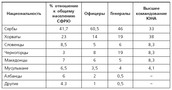 В свою очередь, с югославской стороны особое внимание придавалось этническому составу командного состава. Высшие официальные лица, близкие к Тито, подчеркивали: «Несмотря на то, что 70% офицерского корпуса составляют преимущественно сербы, армия в настоящий момент не предпринимает действий, направленных на захват власти»[1359]. Со всей очевидностью определились три основные задачи, которые стояли перед ЮНА: защита от внешнего агрессора; консолидация СФРЮ как федеративного государства, в котором существуют межэтнические противоречия, и, наконец, укрепление и обеспечение единства СКЮ, организационно построенной по республиканскому принципу и подверженной влиянию межэтнических противоречий[1360]. Власти страны и иностранные аналитики отмечали, что для самой ЮНА последнее имело принципиальное значение, так как обострение этнического вопроса было способно при определенных обстоятельствах серьезно ослабить обороноспособность СФРЮ. Поэтому для руководства Югославии было важно ликвидировать дисбаланс представительства различных национальностей в офицерском корпусе ЮНА и высших органах её управления.
