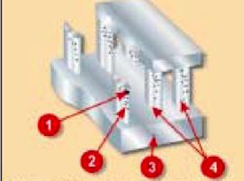Рис 1. Различная степень соляных отложений на лопатках компрессора: 1 - область повышенной коррозии, 2- область пониженной коррозии, 3- статор, 4- лопатка