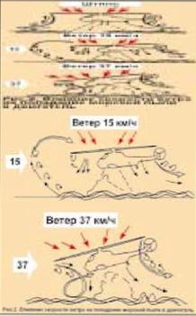 На рис. 2 показана схема зависимости движения морской пыли, поднятой индуктивным воздушным потоком НВ вертолета, от направления и скорости ветра. Рисунок показывает, что наименее приемлемым для вертолета SH-3D Sea King является висение на высоте II = 0,8-1,2 м при скорости ветра 15 км/ч. 1! этом случае расстилающаяся по волной поверхности морская пыль поднимается встречным потоком воздуха и устремляв! ся в район воздухозаборников двигателей. При большей или меньшей скорости ветра этот эффект значительно уменьшается. Строго говоря, неблагоприятная высота висения зависит как от скорости ветра, так и от скорости индуктивного потока НВ. то есть от нагрузки его на ометаемую поверхность.