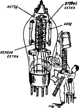 В трехэлектродную лампу ввели вторую сетку, и получилась четырехэлектродная лампа — тетрод. Затем появляется лампа с тремя сетками — пентод. Но и на этом ламповая техника не остановилась. Лаборатории продолжают усиленно работать над дальнейшим развитием лампы: появились лампы с четырьмя сетками — гексод, с пятью сетками — пентагрид — и даже с шестью — октод.